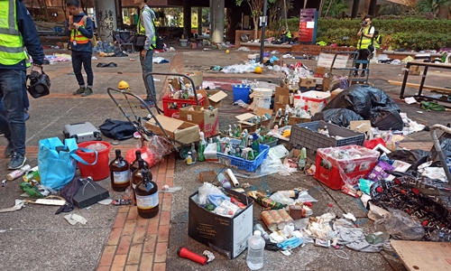 A Global Times reporter who followed police on campus found a glass container of petroleum ether, which could be used to make explosive Molotov cocktails.