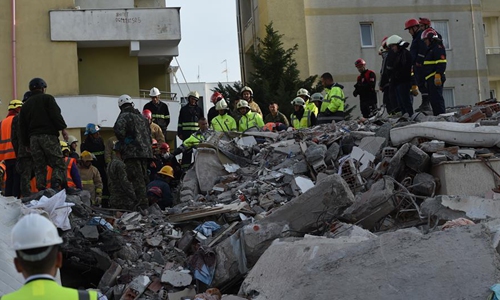 Rescuers work at the site of a collapsed building in the town of Durres, Albania, on Nov. 27, 2019. The death toll of the disastrous earthquake which hit Albania on Tuesday morning climbed to 21, and rescuers continued hunt for survivors, authorities said on Tuesday evening. (Xinhua/Zhang Liyun)