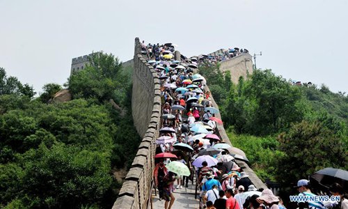 Tourists climb the Badaling section of the Great Wall as they stay in the sweltering weather in Beijing, capital of China, Aug. 5, 2018. (Xinhua/Chen Xiaodong)