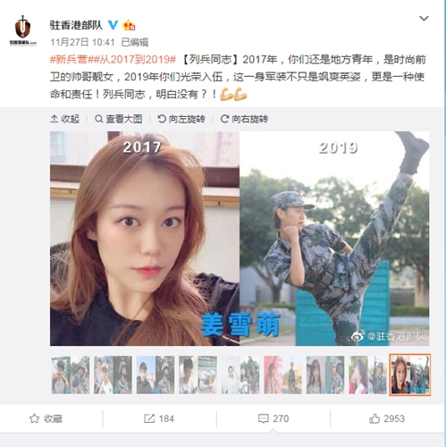 The garrison posted photos of nine groups of soldiers, wearing casual cloths and military uniforms, on Chinese Twitter-like social platform Sina Weibo on Wednesday. The caption read "You were just a good-looking young boy or girl in your hometown in 2017, and you joined the army in 2019. The uniform not only makes you look valiant; it also represents your mission and responsibility. Understand, soldiers?"