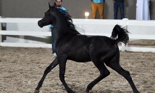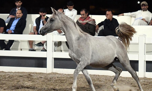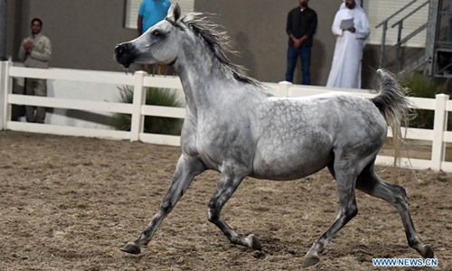 A purebred Arabian horse is seen at an auction in Mubarak Al-Kabeer Governorate, Kuwait, on Nov. 27, 2019. An auction of purebred Arabian horses, attracting more than 100 horse breeders and lovers, was held here on Wednesday. A total of 15 horses of different ages, representing the most important Arabian horse families that were produced and reared in the house of Arabs, were sold at the auction. (Photo by Ghazy Qaffaf/Xinhua)