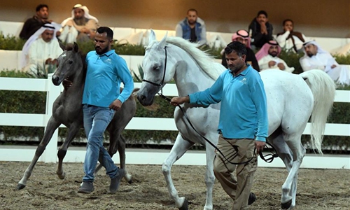 Workers lead purebred Arabian horses to be auctioned in Mubarak Al-Kabeer Governorate, Kuwait, on Nov. 27, 2019. An auction of purebred Arabian horses, attracting more than 100 horse breeders and lovers, was held here on Wednesday. A total of 15 horses of different ages, representing the most important Arabian horse families that were produced and reared in the house of Arabs, were sold at the auction. (Photo by Ghazy Qaffaf/Xinhua)