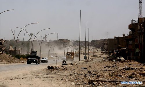 Military and civilian vehicles drive on a road in al-Saha neighborhood of western Mosul, Iraq on May 29, 2017. Iraqi Prime Minister Haider al-Abadi said on Monday that Iraqi forces are in the last stages of defeating Islamic State (IS) militants in the remaining neighborhoods of the western side of Mosul. According to Abadi, the security forces have freed about 95 percent of Mosul. Also on Monday, Maan al-Saadi, commander of Counter-Terrorism Service (CTS) special operations, told Xinhua that the CTS forces have taken control of 70 percent of al-Saha neighborhood in north of the IS-held old city center and killed some 70 IS militants, most of them foreigners and non-Iraqi Arabs, in the battles during the past two days. (Xinhua/Khalil Dawood)
