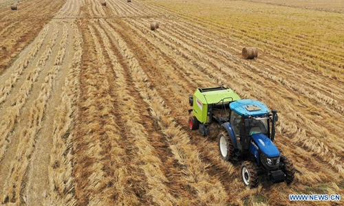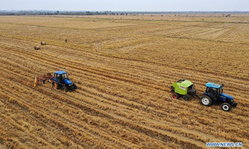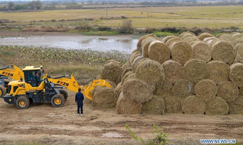 Workers of a wheat straw recycling company collect wheat straw in the field in Jiangxiang Town of Nanchang County, Nanchang, east China's Jiangxi Province, Nov. 29, 2019. (Xinhua/Peng Zhaozhi)
