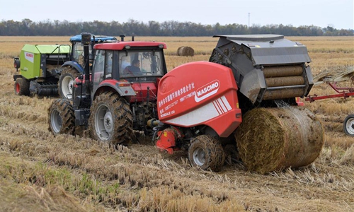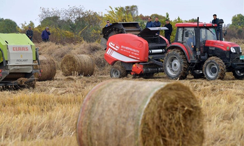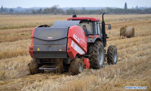 An agricultural vehicle packs up collected wheat straw in the field in Jiangxiang Town of Nanchang County, Nanchang, east China's Jiangxi Province, Nov. 29, 2019. (Xinhua/Peng Zhaozhi)