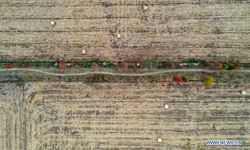 Aerial photo taken on Nov. 29, 2019 shows wheat straw collected in the field in Jiangxiang Town of Nanchang County, Nanchang, east China's Jiangxi Province, Nov. 29, 2019. (Xinhua/Peng Zhaozhi)