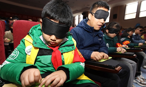 Hundreds of people wear blindfolds to experience being blind at an event held in Xi'an, Northwest China's Shaanxi Province on Saturday, marking the International Day of Persons with Disabilities which falls on Tuesday. Photo: VCG