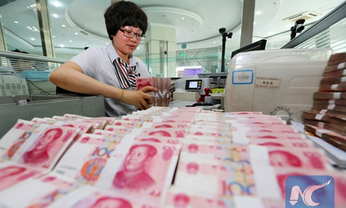 A worker counts Chinese currency Renminbi (RMB) at a bank in Lianyungang, east China's Jiangsu Province. File photo: Xinhua/Si Wei
