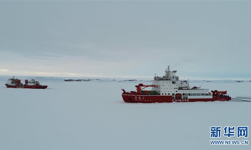 The photo taken on December 1, 2019 shows China's polar icebreakers Xuelong and Xuelong 2 reached the waters near the Zhongshan Station in Antarctica. (Photo/Xinhua)
