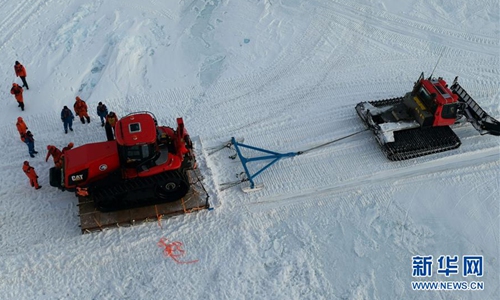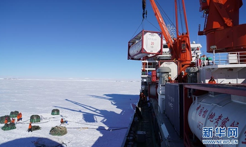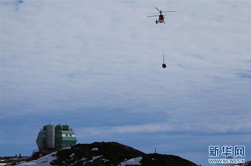 A helicopter unloads cargo from China's polar icebreaker Xuelong in Antarctica on December 1, 2019. China's polar icebreakers Xuelong and Xuelong 2 on November 27, 2019 reached the waters near the Zhongshan Station in Antarctica. (Photo/Xinhua)