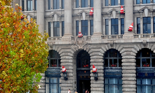 More than a dozen pint-sized "Santa Clauses" appear to scale a building on the historic Bund in Shanghai on Sunday as the city takes on a festive atmosphere ahead of Christmas. Photo: VCG