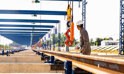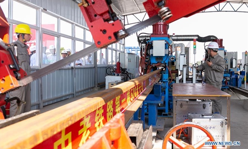 Workers work at the welding base for the China-Laos railway project in Vientiane, Laos, Dec. 2, 2019. On the 44th anniversary of the funding of the Lao People's Democratic Republic on Dec. 2, 2019, the China Railway No.2 Engineering Group (CREC-2) has welded the first 500-meter-long rail for the China-Laos railway project in Lao capital Vientiane. The rail, which is to be installed along the seamless China-Laos railway, is also the first long railway rail in the history of Lao transportation, of southeastern Asian transportation and is also the longest one in Asia so far, except in China. The success of the welding also marked that the welding base for the China-Laos railway project was formally put into operation, laying a solid foundation for the railing of the China-Laos Railway. (Photo by Kaikeo Saiyasane/Xinhua)