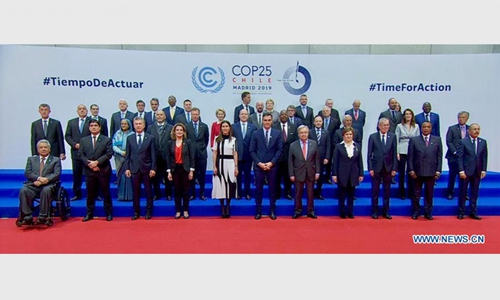 This image grabbed from a video shows delegates posing for a group photo while attending the United Nations Climate Change Conference COP25 in Madrid, Spain, Dec. 2, 2019. The United Nations Climate Change Conference COP25 officially opened here on Monday, where delegates are discussing measures to implement the 2015 Paris Agreement. (Xinhua)