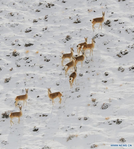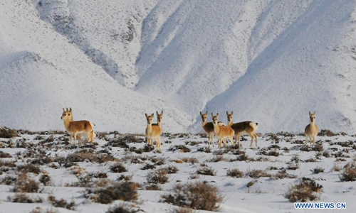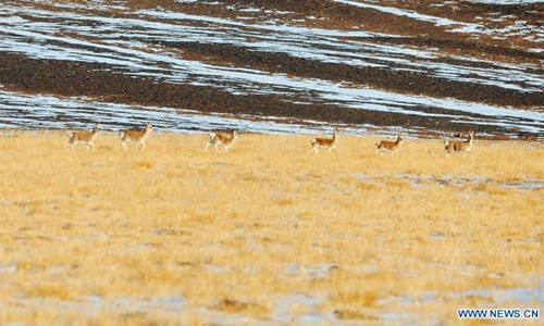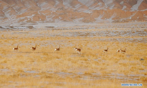 Tibetan gazelles forage at Haltent Grassland in Kazak Autonomous County of Aksay, northwest China's Gansu Province, Nov. 30, 2019. (Photo by Ma Xiaowei/Xinhua)