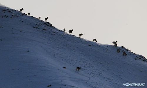 Argali sheep forage at Haltent Grassland in Kazak Autonomous County of Aksay, northwest China's Gansu Province, Nov. 30, 2019. (Photo by Ma Xiaowei/Xinhua)