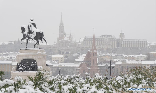 A snow-covered statue is seen with the landmark Mathias Church and Fishermen's Bastion in the background in Budapest, Hungary on Dec. 2, 2019. The first winter snowfall hit Budapest on Monday. (Photo by Attila Volgyi/Xinhua)