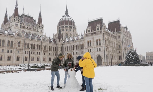 Tourists make a snowman on the snow-covered Kossuth Square in front of the Parliament in Budapest, Hungary on Dec. 2, 2019. The first winter snowfall hit Budapest on Monday. (Photo by Attila Volgyi/Xinhua)