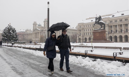 Tourists walk on the snow-covered Kossuth Square in Budapest, Hungary on Dec. 2, 2019. The first winter snowfall hit Budapest on Monday. (Photo by Attila Volgyi/Xinhua)