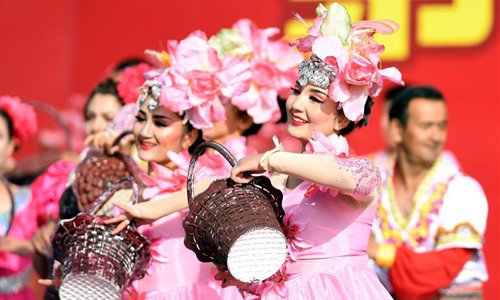 Actresses perform during a jujube harvest festival in Qiemo County, northwest China's Xinjiang Uygur Autonomous Region, Oct. 19, 2019. Qiemo County, situated in the Mongolian Autonomous Prefecture of Bayingolin and on the edge of the Tarim Basin, is known for high-quality jujube production. (Xinhua/Sadat)