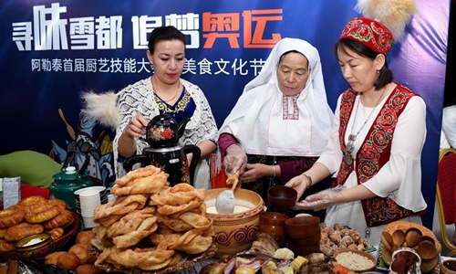 Women of Kazakh ethnic group show their traditional food in Altay, northwest China's Xinjiang Uygur Autonomous Region, Nov. 27, 2019. The 14th Xinjiang Winter Tourism Trade Fair opened here on Wednesday. (Xinhua/Sadat)