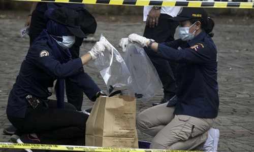 Indonesian police officers bring evidence at the smoke grenade explosion site at Monument National in Jakarta, Indonesia, Dec. 3, 2019. (Xinhua/Aditya Irawan)