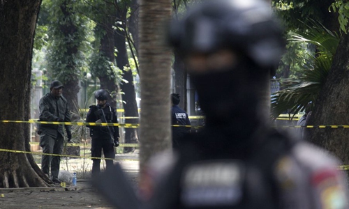 Indonesian police officers stand guards at the smoke grenade explosion site at Monument National in Jakarta, Indonesia, Dec. 3, 2019. (Xinhua/Aditya Irawan)