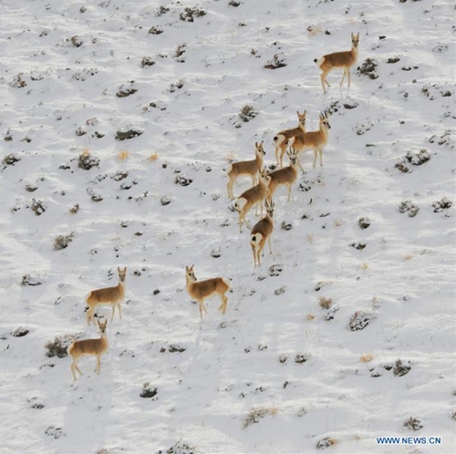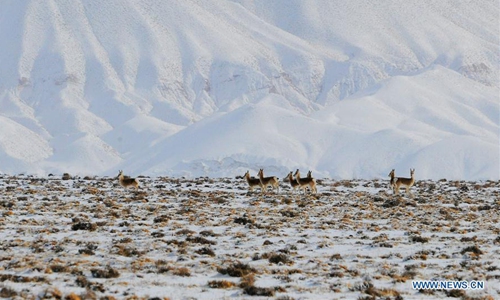 Tibetan gazelles forage at Haltent Grassland in Kazak Autonomous County of Aksay, northwest China's Gansu Province, Nov. 30, 2019. (Photo by Ma Xiaowei/Xinhua)