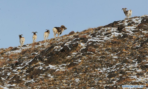 Argali sheep forage at Haltent Grassland in Kazak Autonomous County of Aksay, northwest China's Gansu Province, Nov. 30, 2019. (Photo by Ma Xiaowei/Xinhua)