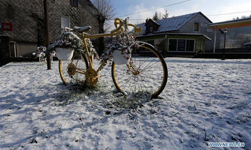 A snow-covered bicycle is seen in Delnice, a town in the mountainous region of western Croatia, on Dec. 3, 2019. (Goran Kovacic/Pixsell via Xinhua)