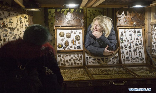 A vendor sells traditional Latvian jewelery at a Christmas market in Riga, Latvia, on Dec. 3, 2019. (Photo by Edijs Palens/Xinhua)