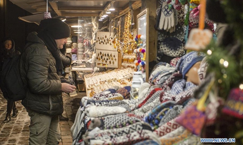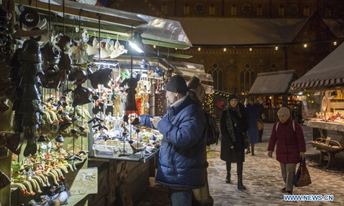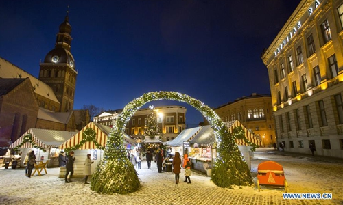 People visit a Christmas market in Riga, Latvia, on Dec. 3, 2019. (Photo by Edijs Palens/Xinhua)