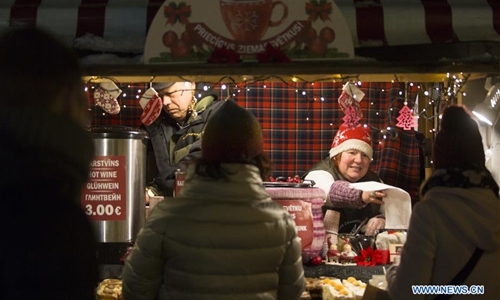 A vendor serves customers at a Christmas market in Riga, Latvia, on Dec. 3, 2019. (Photo by Edijs Palens/Xinhua)