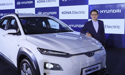 S S Kim, CEO of Hyundai Motor India, poses with a Hyundai electric compact SUV during the vehicle’s launch at the Buddh International Circuit in India on July 9. Photo: VCG