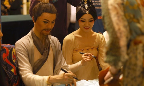 Performers of the dance drama "Confucius" sign for fans at the backstage of Mariinsky Theatre in St. Petersburg, Russia, Dec. 3, 2019. The dance drama "Confucius", performed by the China National Opera and Dance Drama Theatre, was staged on Tuesday at Mariinsky Theatre. (Photo by Vera Zaraeva/Xinhua)