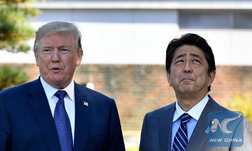 File Photo: U.S. President Donald Trump (L) meets with Japanese Prime Minister Shinzo Abe upon his arrival at the Kasumigaseki Country Club in Kawagoe, near Tokyo, Japan, Nov. 5, 2017.(Xinhua)