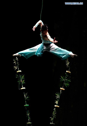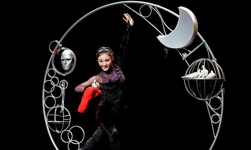 An acrobat performs during a magic and acrobatic show at the Henan Art Center in Zhengzhou, central China's Henan Province, Dec. 4, 2019. (Xinhua/Li An)