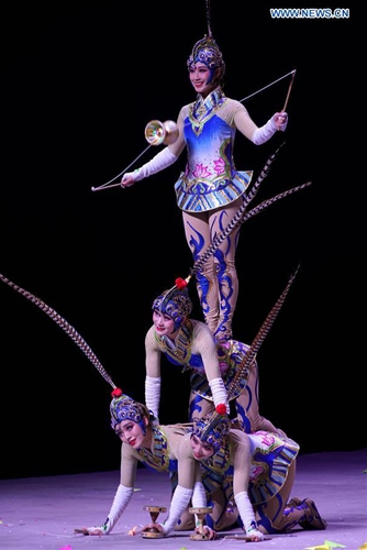 Acrobats perform during a magic and acrobatic show at the Henan Art Center in Zhengzhou, central China's Henan Province, Dec. 4, 2019. (Xinhua/Li An)