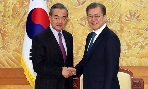 Chinese State Councilor and Foreign Minister Wang Yi (left) shakes hands with South Korean President Moon Jae-in on Thursday. Photo: IC