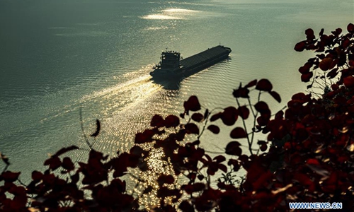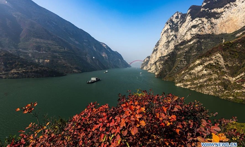 A boat sails along the Three Gorges section of Yangtze River in Zigui County of Yichang, central China's Hubei Province on Dec. 7, 2019. Photo:Xinhua