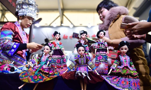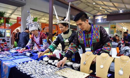 Exhibitors from Rongshui Miao Autonomous County of south China's Guangxi displays accessories at a local fair in Lianjiang, south China's Guangdong Province, Dec. 7, 2019. The fair provides a platform to showcase specialty products from Rongshui and promote the county's tourists attractions. For over two years, Lianjiang has been offering financial and technological assistance to Rongshui in its poverty-alleviation efforts, and the partnership has achieved good results. (Xinhua/Huang Xiaobang)