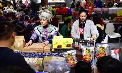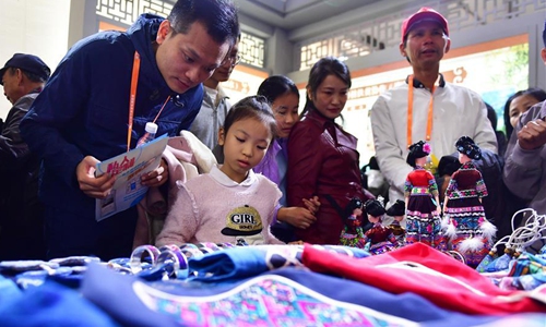 Visitors choose souvenirs from Rongshui Miao Autonomous County of south China's Guangxi at a local fair in Lianjiang, south China's Guangdong Province, Dec. 7, 2019. The fair provides a platform to showcase specialty products from Rongshui and promote the county's tourists attractions. For over two years, Lianjiang has been offering financial and technological assistance to Rongshui in its poverty-alleviation efforts, and the partnership has achieved good results. (Xinhua/Huang Xiaobang)