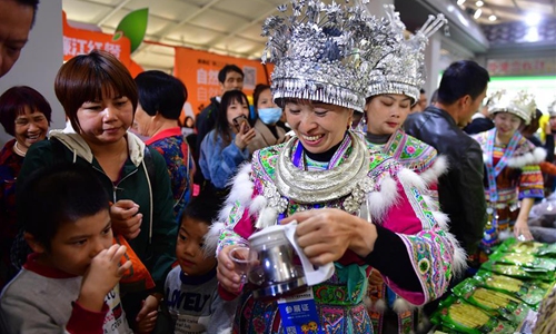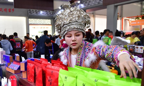 Du Yuxi, an exhibitor from Rongshui Miao Autonomous County of south China's Guangxi, sells tea at a local fair in Lianjiang, south China's Guangdong Province, Dec. 7, 2019. The fair provides a platform to showcase specialty products from Rongshui and promote the county's tourists attractions. For over two years, Lianjiang has been offering financial and technological assistance to Rongshui in its poverty-alleviation efforts, and the partnership has achieved good results. (Xinhua/Huang Xiaobang)