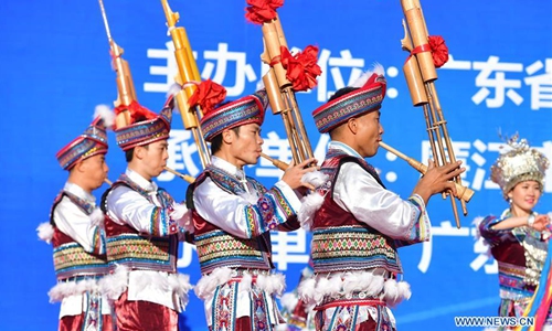 Artists from Rongshui Miao Autonomous County of south China's Guangxi perform Lusheng, a folk musical instrument made of bamboo pipes, during the opening ceremony of a local fair in Lianjiang, south China's Guangdong Province, Dec. 7, 2019. The fair provides a platform to showcase specialty products from Rongshui and promote the county's tourists attractions. For over two years, Lianjiang has been offering financial and technological assistance to Rongshui in its poverty-alleviation efforts, and the partnership has achieved good results. (Xinhua/Huang Xiaobang)