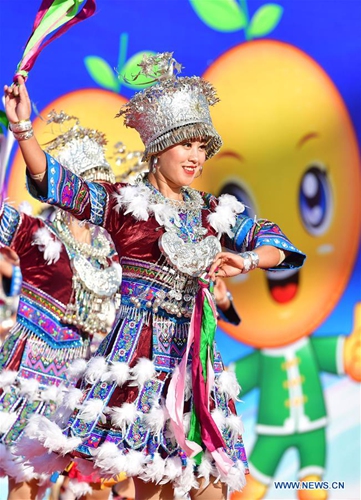 Artists from Rongshui Miao Autonomous County of south China's Guangxi perform during the opening ceremony of a local fair in Lianjiang, south China's Guangdong Province, Dec. 7, 2019. The fair provides a platform to showcase specialty products from Rongshui and promote the county's tourists attractions. For over two years, Lianjiang has been offering financial and technological assistance to Rongshui in its poverty-alleviation efforts, and the partnership has achieved good results. (Xinhua/Huang Xiaobang)