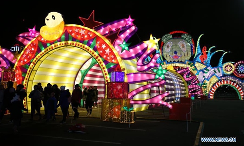 People visit the Hello Panda Festival at Citi Field baseball park in New York, the United States, on Dec. 6, 2019. Hello Panda Festival, a lantern-art extravaganza presented by the China Performing Arts Agency (CPAA) North America, unveiled its illuminated displays Friday evening here at Citi Field baseball park. Handcrafted by 60 world-renowned lantern artisans, some 120 lantern displays have been created representing a diverse range of shapes and sizes, including an 18-meter-tall Christmas tree, a 30-meter-long panda-themed light tunnel, as well as life-sized dinosaurs, giant pandas, and more. (Xinhua/Qin Lang)