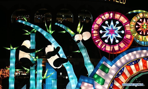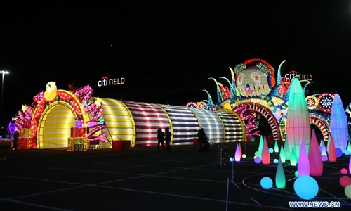 Illuminated lanterns are seen during a media preview of the Hello Panda Festival at Citi Field baseball park in New York, the United States, on Dec. 5, 2019. Hello Panda Festival, a lantern-art extravaganza presented by the China Performing Arts Agency (CPAA) North America, unveiled its illuminated displays Friday evening here at Citi Field baseball park. Handcrafted by 60 world-renowned lantern artisans, some 120 lantern displays have been created representing a diverse range of shapes and sizes, including an 18-meter-tall Christmas tree, a 30-meter-long panda-themed light tunnel, as well as life-sized dinosaurs, giant pandas, and more. (Xinhua/Qin Lang)