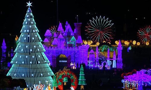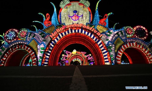 Illuminated lanterns are seen at the Hello Panda Festival at Citi Field baseball park in New York, the United States, on Dec. 6, 2019. Hello Panda Festival, a lantern-art extravaganza presented by the China Performing Arts Agency (CPAA) North America, unveiled its illuminated displays Friday evening here at Citi Field baseball park. Handcrafted by 60 world-renowned lantern artisans, some 120 lantern displays have been created representing a diverse range of shapes and sizes, including an 18-meter-tall Christmas tree, a 30-meter-long panda-themed light tunnel, as well as life-sized dinosaurs, giant pandas, and more. (Xinhua/Qin Lang)
