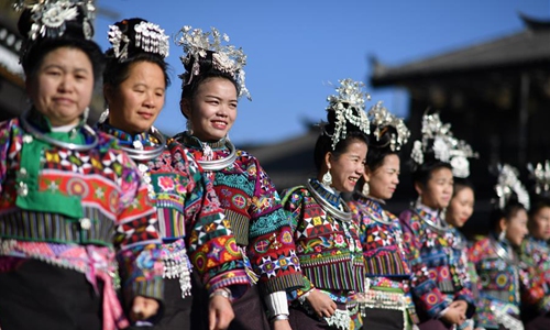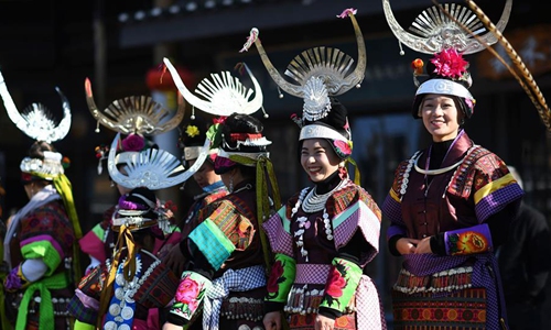 Women of Miao ethnic group in traditional costumes attend a celebration of Jiyou Festival, a traditional folk festival, in Danzhai County of Qiandongnan Miao and Dong Autonomous Prefecture, southwest China's Guizhou Province, Dec. 7, 2019. (Xinhua/Yang Wenbin)
