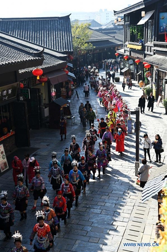 People of Miao ethnic group in traditional costumes attend a celebration of Jiyou Festival, a traditional folk festival, in Danzhai County of Qiandongnan Miao and Dong Autonomous Prefecture, southwest China's Guizhou Province, Dec. 7, 2019. (Xinhua/Yang Wenbin)