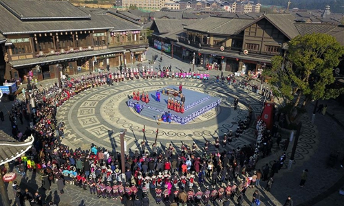 Aerial photo taken on Dec. 7, 2019 shows people of Miao ethnic group celebrating Jiyou Festival, a traditional folk festival, in Danzhai County of Qiandongnan Miao and Dong Autonomous Prefecture, southwest China's Guizhou Province. (Xinhua/Yang Wenbin)